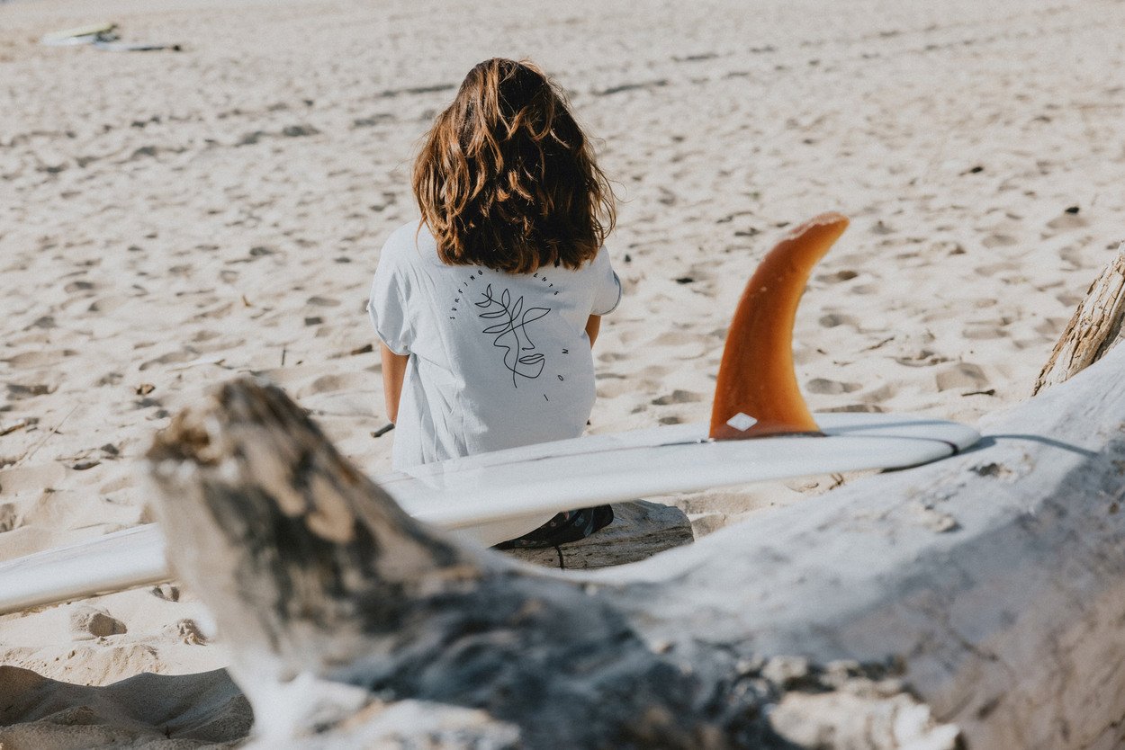 The Tee Stoked Women features an artsy backprint and minimalistic pocket print.